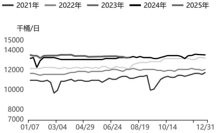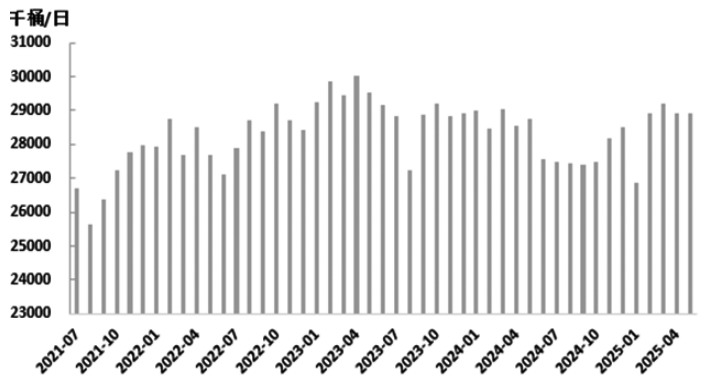 上半年,美国经济增长进一步放缓,关税政策对美国经济也造成了较强的负面冲击,进而抑制了美国的原油消费。机构预计,今年美国原油消费增幅仅为10万桶/日。当前正值夏季原油消费旺季,美国终端原油需求处于季节性高峰阶段,炼厂开工负荷处于年内高位,特别是终端柴油供应偏紧,柴油裂解利润持续攀升。然而,从时间周期来看,美国原油旺季需求临近尾声,后续炼厂开工以及终端原油需求的增长空间均相对有限。