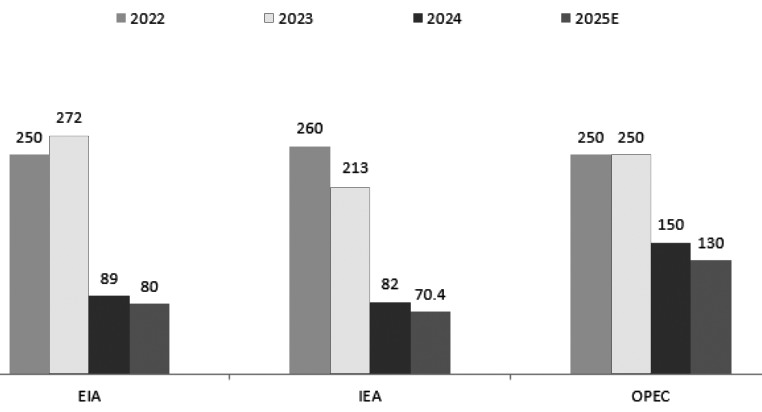 全球原油供给预计保持增长态势,根据美国能源信息署(EIA)的预估,2025年,全球原油产量将每日增长181万桶,达到历史新高。一方面,OPEC+自4月起逐步恢复产能;另一方面,包括巴西、加拿大等在内的非OPEC国家的原油产量也保持增长。然而,由于能源公司经营思路发生变化,再加上上半年油价持续走低,国际能源署(IEA)预计2025年全球上游油气投资同比减少4%,为2020年以来首次出现下降,油气上游投资下降在一定程度上限制原油的产出。