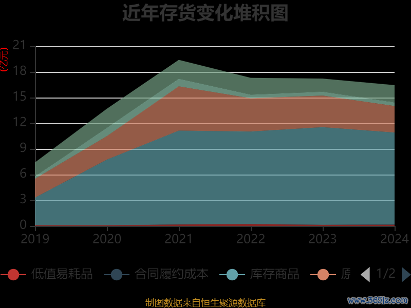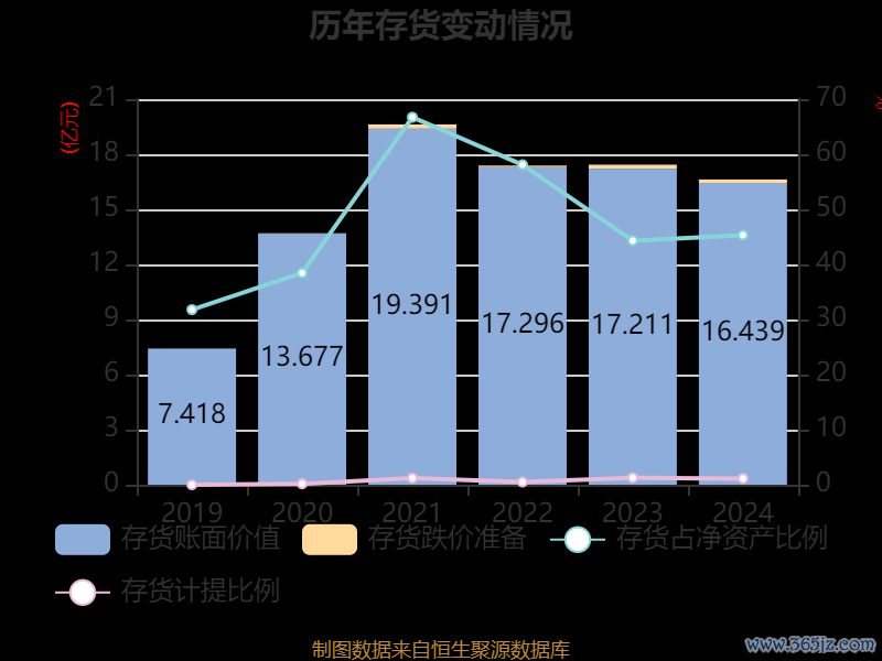 从存货变动来看,截至2024年末,公司存货账面价值为16.44亿元,占净资产的45.31%,较上年末减少7714.53万元。其中,存货跌价准备为1868.92万元,计提比例为1.12%。