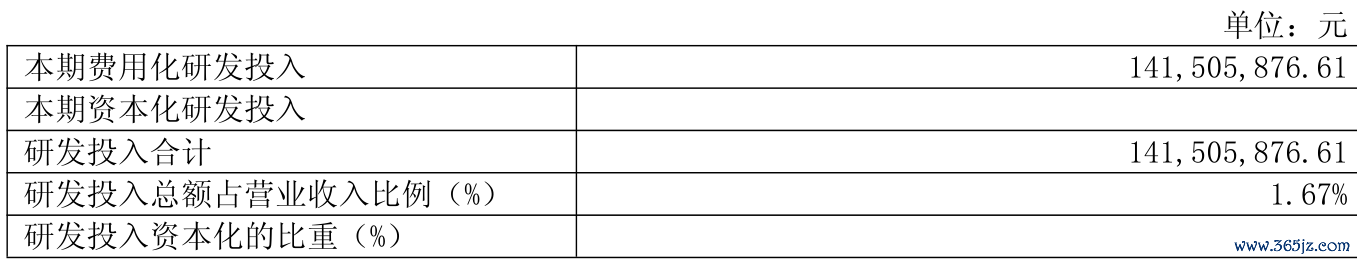 2024年全年,公司研发投入金额为1.42亿元,同比增长22.35%;研发投入占营业收入比例为1.67%,相比上年同期上升0.22个百分点。此外,公司全年研发投入资本化率为0%。