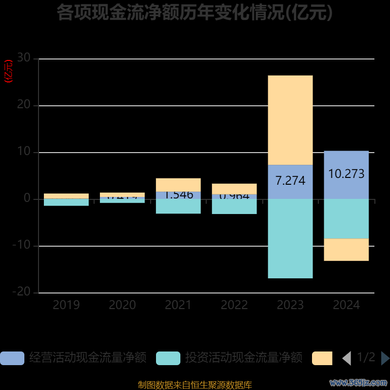 截至2024年,公司经营活动现金流净额为10.27亿元,同比增长41.24%;筹资活动现金流净额-4.79亿元,同比减少23.89亿元;投资活动现金流净额-8.46亿元,上年同期为-16.97亿元。
