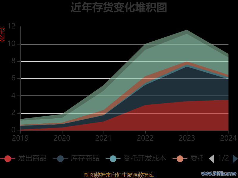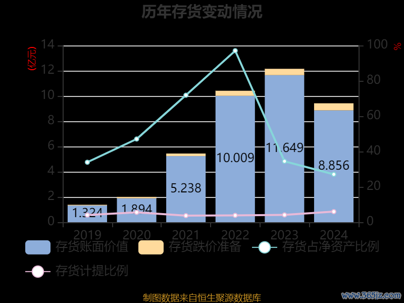 从存货变动来看,截至2024年末,公司存货账面价值为8.86亿元,占净资产的27.08%,较上年末减少2.79亿元。其中,存货跌价准备为5631.34万元,计提比例为5.98%。