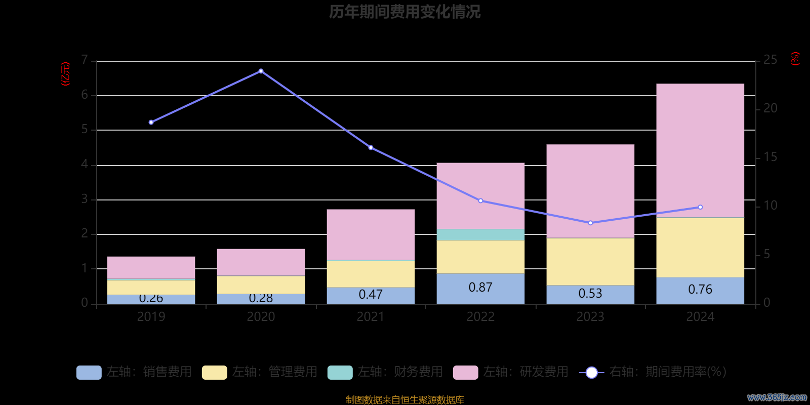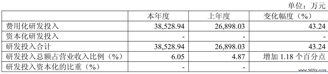 2024年全年,公司研发投入金额为3.85亿元,同比增长43.24%;研发投入占营业收入比例为6.05%,相比上年同期上升1.18个百分点。