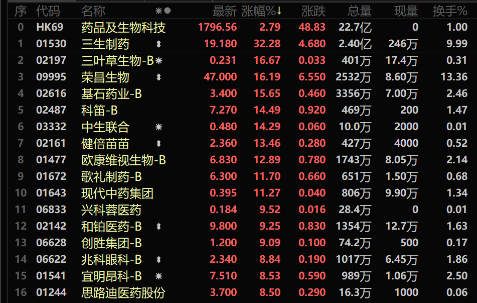 周二,港股市场生物医药股集体大爆发。恒生生物科技指数一度大涨超4%,板块内三生制药(3SBio)一度暴涨超40%,荣昌生物大涨超16%,瀚森制药、石药集团等皆大幅走高。